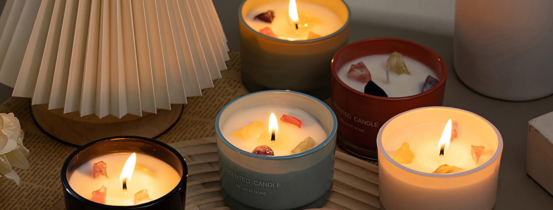 عناصر سنگ کریستال : شمول از سنگ های کریستالی در شمع هم هدف تزیینی و هم عاطفی است. کریستال هایی مانند آمیتیست ، رز کوارتز ، و کوارتز شفاف اغلب گنجانده شده اند، اعتقاد بر این است که هر کدام دارای خواص منحصر به فردی هستند که می توانند انرژی عاطفی مثبت را تقویت کنند. به عنوان مثال، رز کوارتز برای پرورش عشق و هماهنگی شناخته شده است، در حالی که آمیتیست با آرامش و کاهش استرس همراه است.